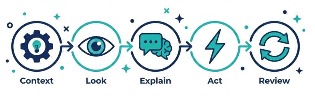 The C.L.E.A.R. method — Context, Look, Explain, Act, Review — turns any dataset into a decision cycle. The six prompts give you the exact questions to ask at each stage.