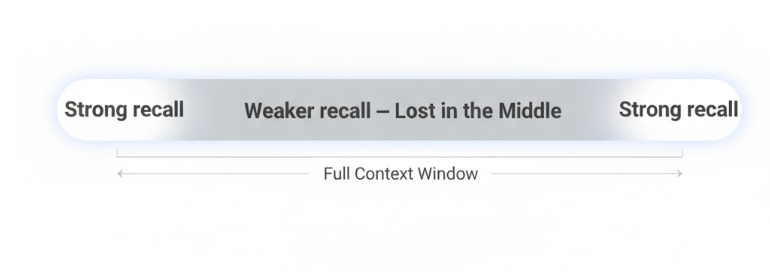 It remembers the beginning well. It remembers the end well. But information buried in the middle? It gets less attention.