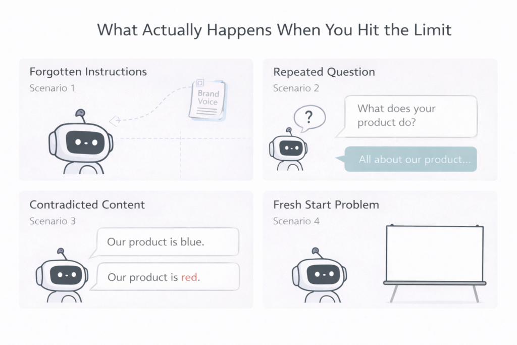 Why? Your brand voice instructions scrolled out of the context window. AI literally can’t see them anymore.