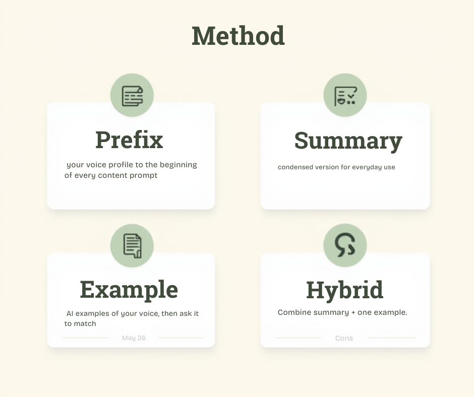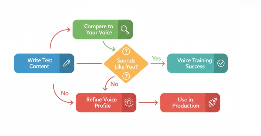 Day 4: Testing (45 minutes) Generate 3 pieces of content using your voice profile. Read them. Note what works and what’s off.