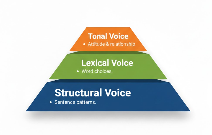 - Three-layer voice architecture (structural, lexical, tonal)