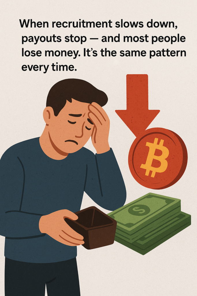 These returns don’t come from real profits, but from the money new investors are contributing. The early investors are thrilled and tell everyone they know.