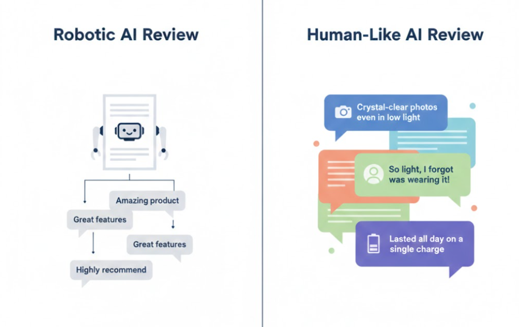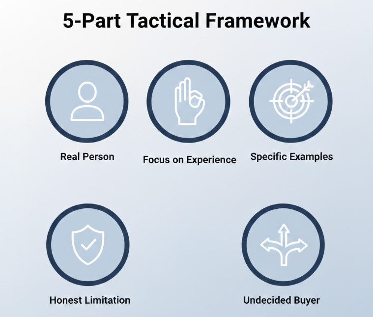 Give it a real person to write as. Focus on experiences, not specs. Demand specific examples. Require honest limitations. Write for undecided buyers.