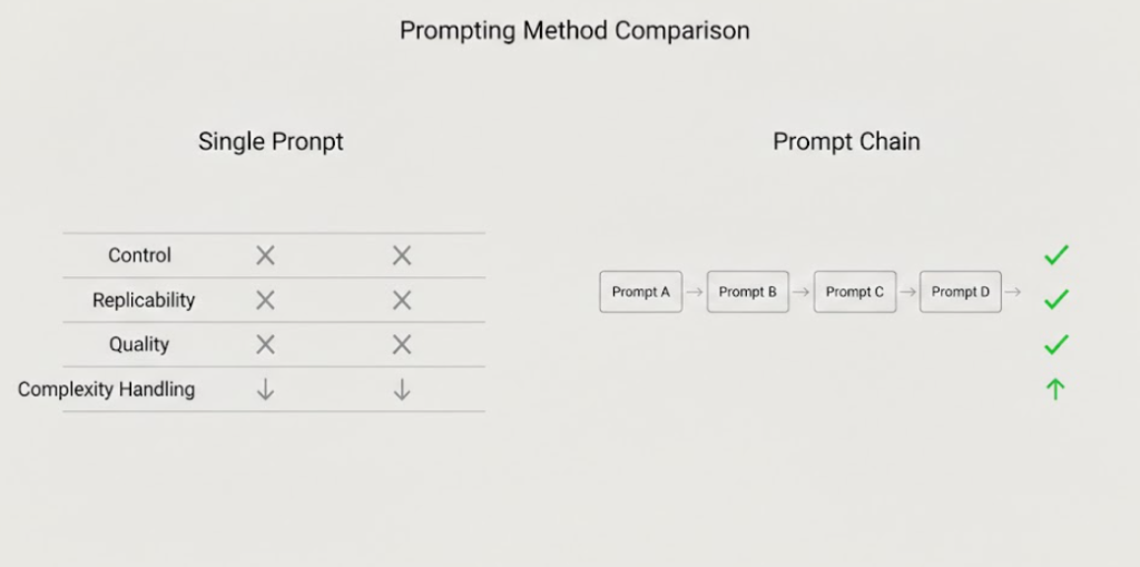 [Image suggestion: Visual diagram showing single massive prompt (messy output) vs. chain of connected prompts (clean, structured output)]